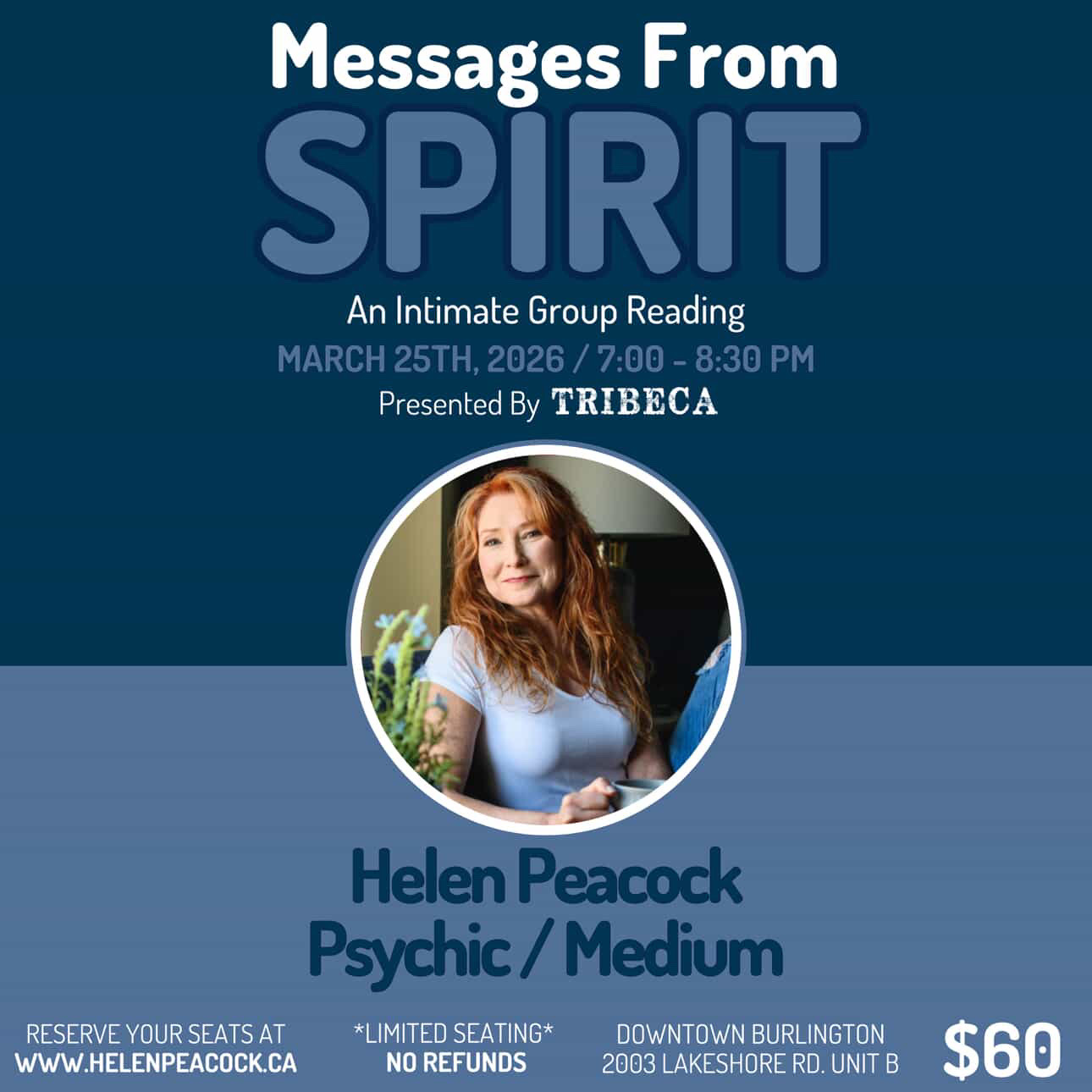 Join Helen for an Intimate Group Reading where she will demonstrate that your Loved One’s in Spirit are around you and wish to communicate with you.