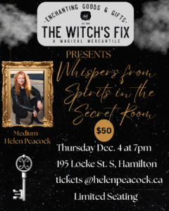 Join Spiritual Medium Helen Peacock for an unforgettable evening of love, laughter, and connection as she shares heartfelt Whispers from Spirits in an intimate new space — The Secret Room at The Witches Fix.